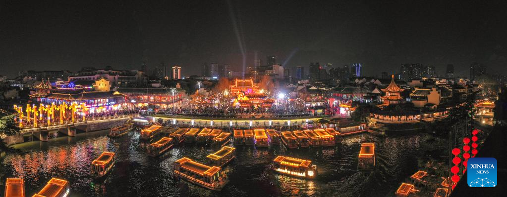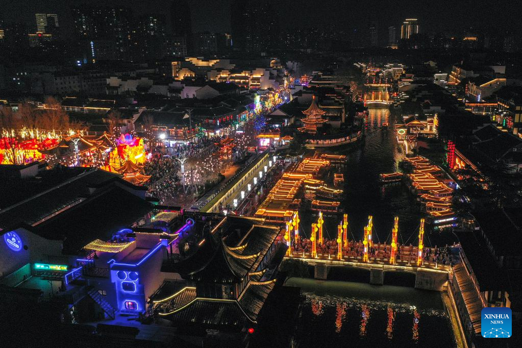 This aerial photo taken on Feb. 4, 2023 shows a night view of a lantern fair at the Fuzi (Confucius) Temple scenic area in Nanjing, east China's Jiangsu Province. Lantern fairs and light shows were held to celebrate the Lantern Festival, which falls on Feb. 5 this year. (Xinhua/Li Bo)