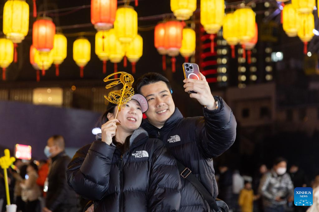 Tourists take a selfie at a lantern fair at Jinjiang amusement park in east China's Shanghai, Feb. 4, 2023. Lantern fairs and light shows were held to celebrate the Lantern Festival, which falls on Feb. 5 this year. (Xinhua/Wang Xiang)