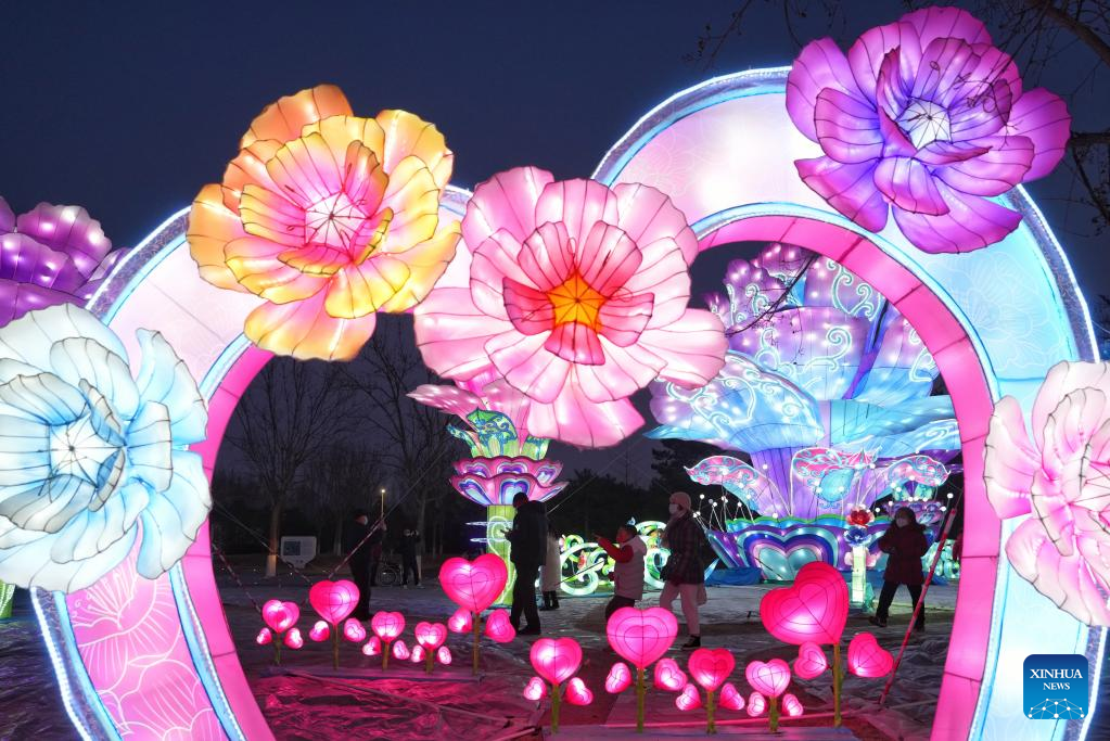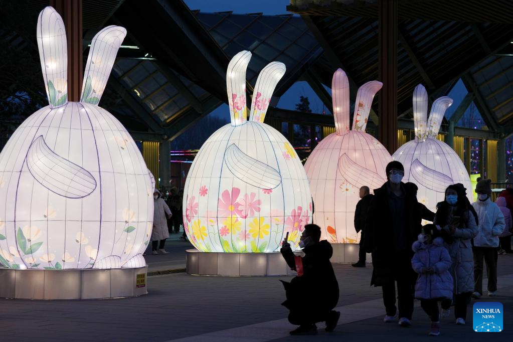 Tourists visit a light show at Nangong World Botanical Amusement Park in Beijing, capital of China, Feb. 5, 2023. Lantern fairs and light shows were held to celebrate the Lantern Festival, which falls on Feb. 5 this year. (Xinhua/Ren Chao)