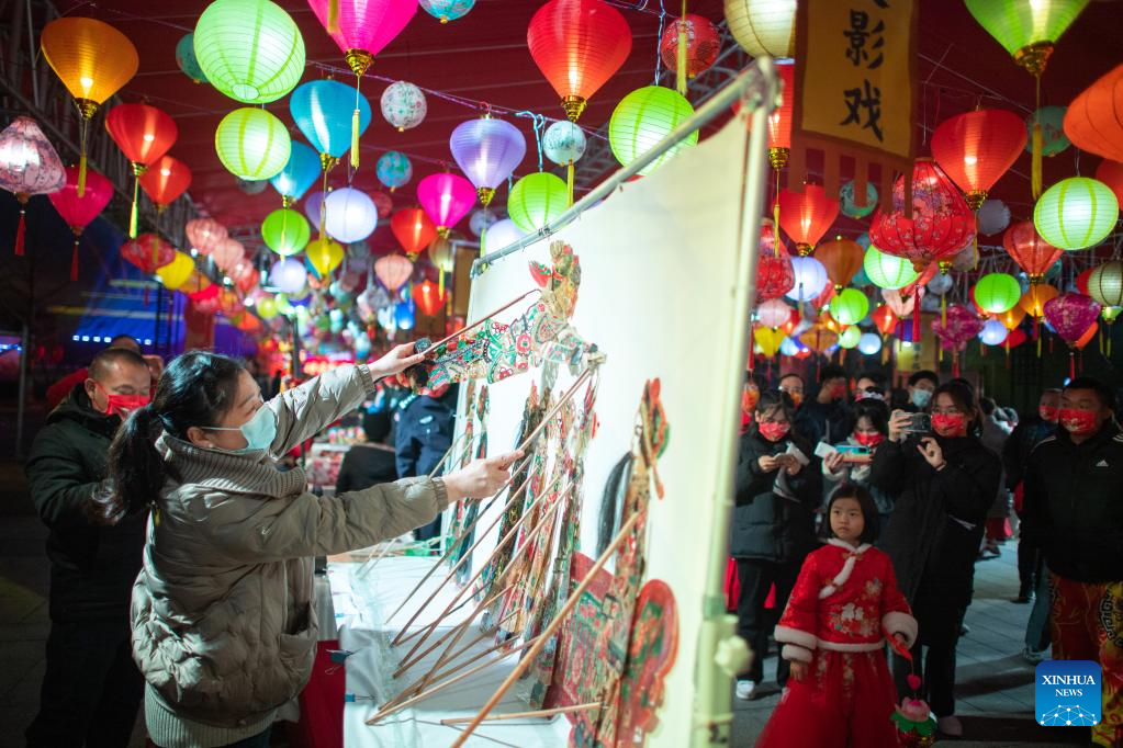 People experience shadow puppetry during a lantern fair at Hubei Provincial Museum in Wuhan, central China's Hubei Province, Feb. 5, 2023. Lantern fairs and light shows were held to celebrate the Lantern Festival, which falls on Feb. 5 this year. (Xinhua/Xiao Yijiu)