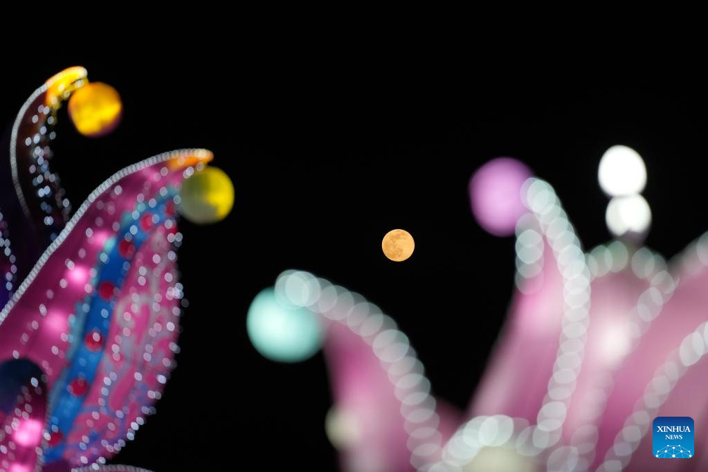 The moon and light installations are pictured during a light show at Beijing Expo Park in Beijing, capital of China, Feb. 5, 2023. Lantern fairs and light shows were held to celebrate the Lantern Festival, which falls on Feb. 5 this year. (Xinhua/Ju Huanzong)