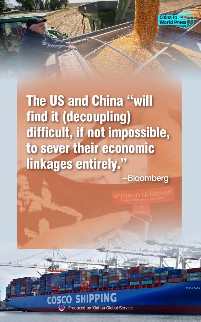 Decoupling isn't yet happening in any significant way, not by a long shot, and isn't likely to, Foreign Policy magazine said in an analysis. It quoted U.S. business insiders as saying that the U.S.-China economic relationship remains profound and is growing deeper in many sectors, and that a decoupling will undercut U.S. global competitiveness.