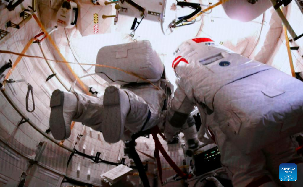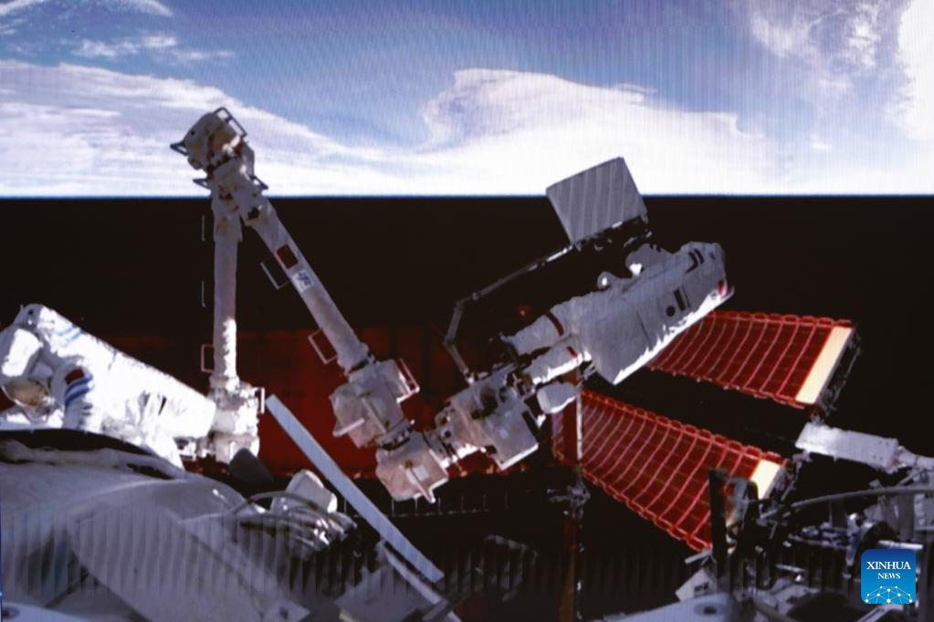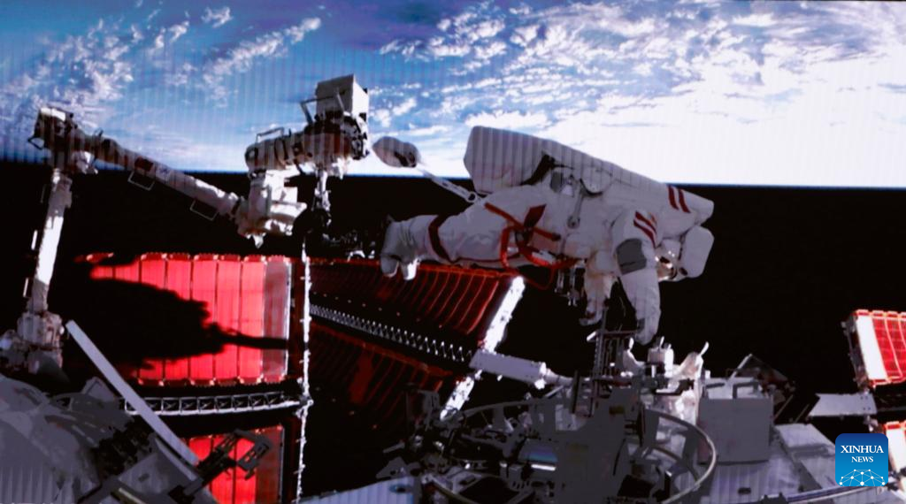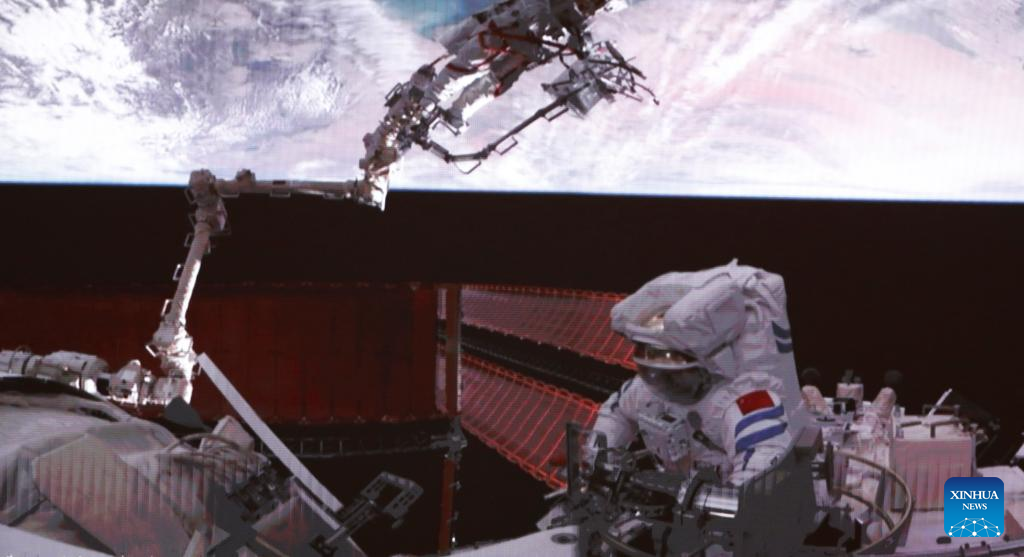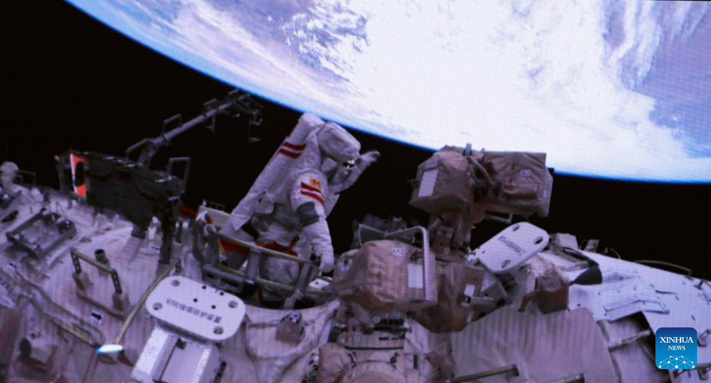 The Shenzhou-15 taikonauts on board the orbiting Chinese Tiangong space station completed their first spacewalk at 12:16 a.m. (Beijing Time) on Friday, according to the China Manned Space Agency. (Xinhua/Liu Fang)