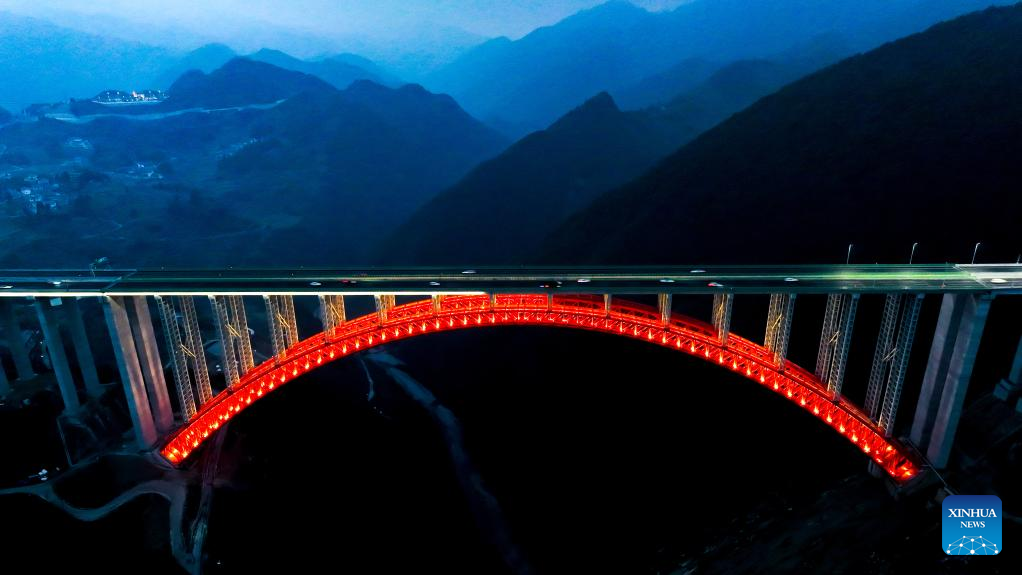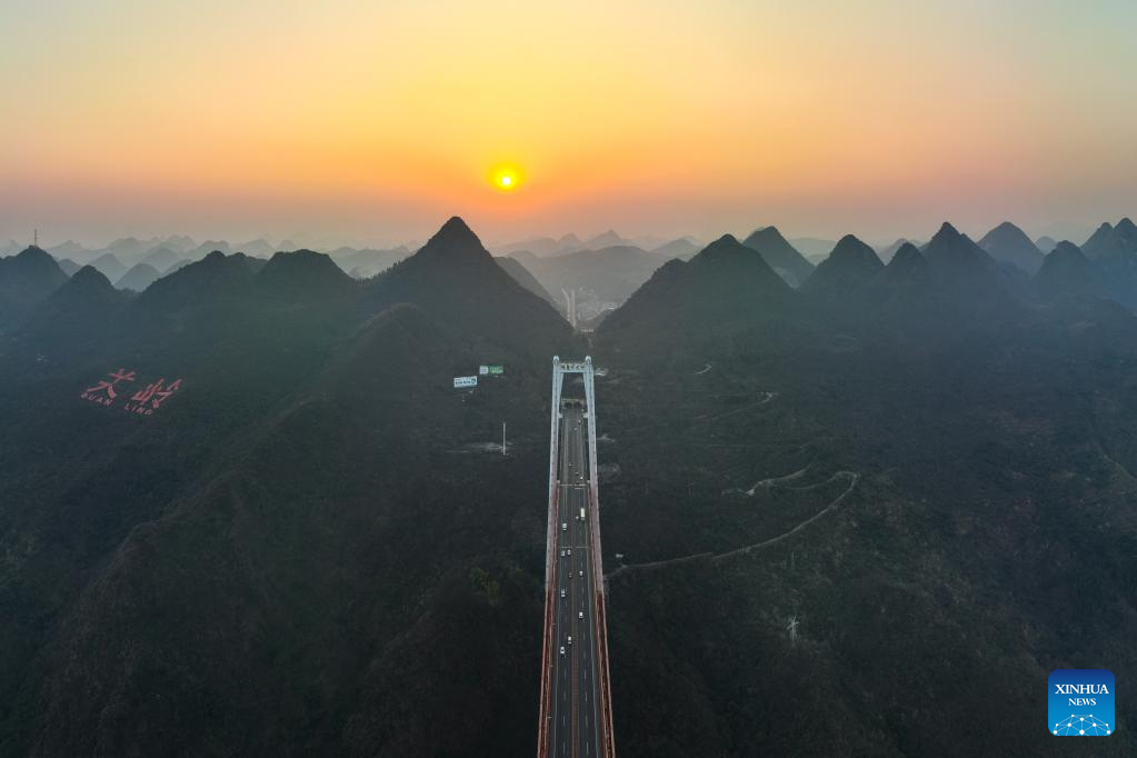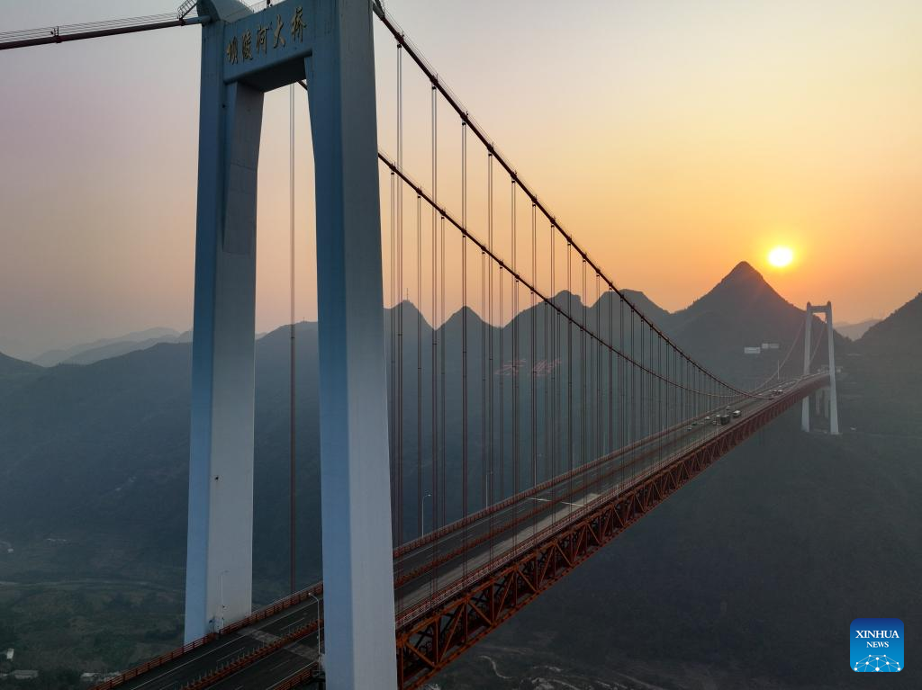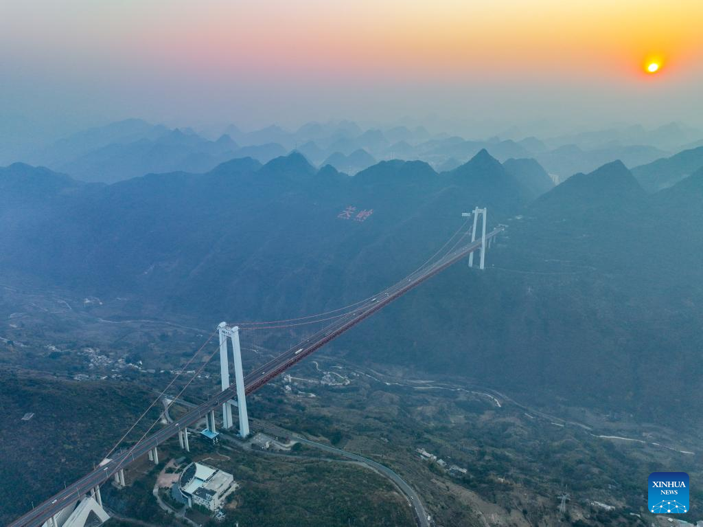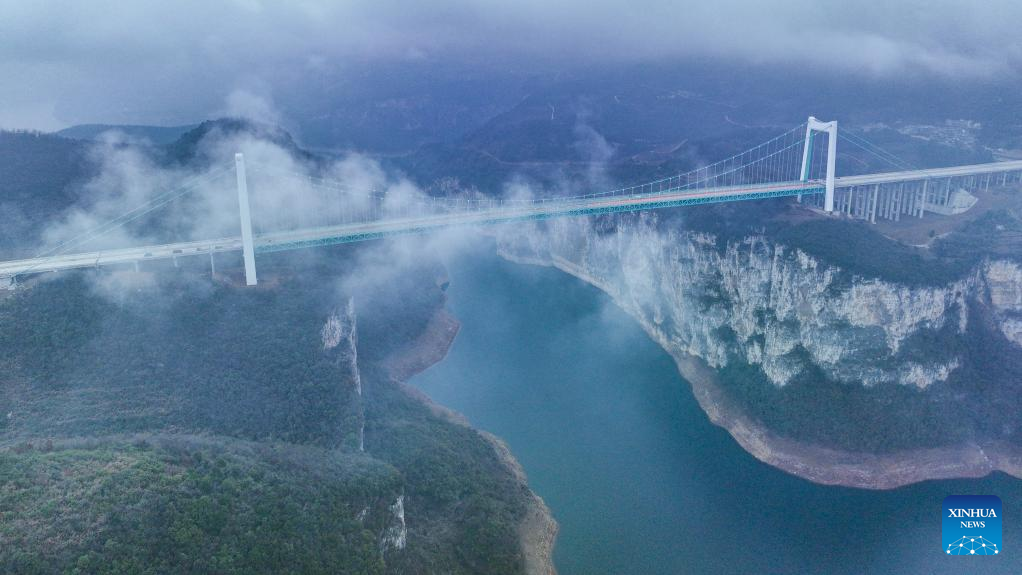 This aerial photo taken on Feb. 1, 2023 shows the Huayudong bridge in southwest China's Guizhou Province. Guizhou has nearly half of the 100 tallest bridges in the world. Due to the large number of bridges, their types and complex technologies used in the construction of the bridges, the province is known as "the museum of world bridges". (Xinhua/Ou Dongqu)
