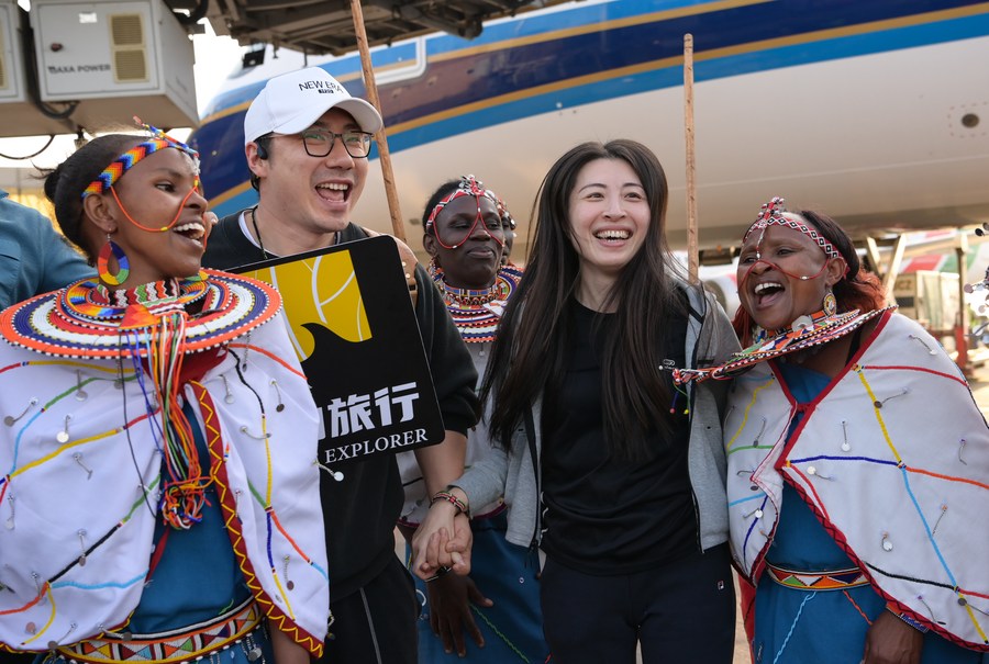 Chinese tourists interact with Maasai performers at Jomo Kenyatta International Airport in Nairobi, Kenya, Feb. 11, 2023. A flight carrying 40 Chinese group tourists arrived at Jomo Kenyatta International Airport in Nairobi on Saturday. (Xinhua/Han Xu)