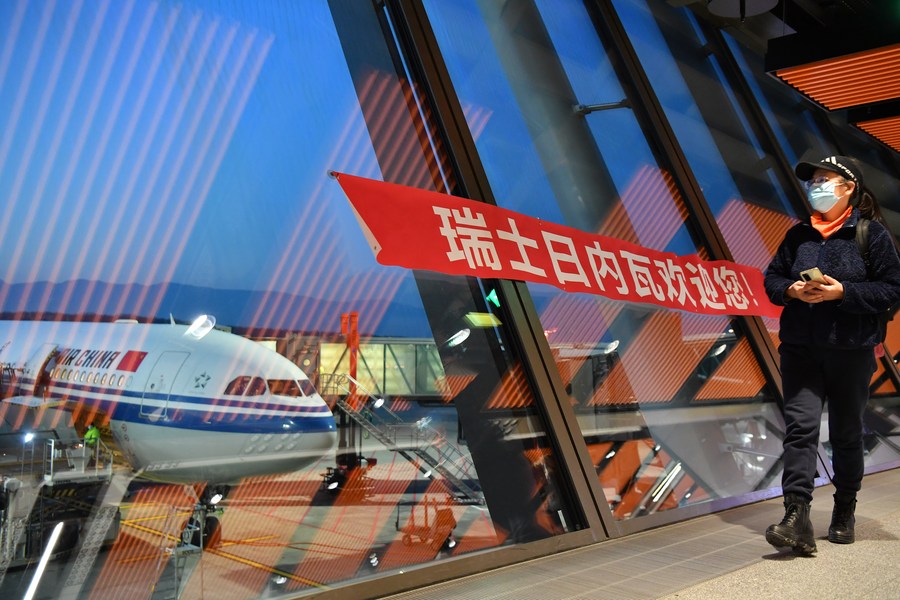 A Chinese tourist walks past a banner reading "Welcome to Geneva in Switzerland" with the first resumed Beijing-Geneva direct flight in the background at the Geneva International Airport in Geneva, Switzerland, Feb. 9, 2023. (Xinhua/Lian Yi)