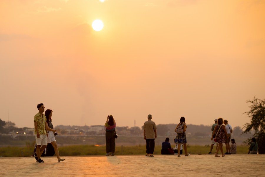 Tourists walk at a square by Mekong River in Lao capital Vientiane on Feb. 8, 2023. (Photo by Kaikeo Saiyasane/Xinhua)