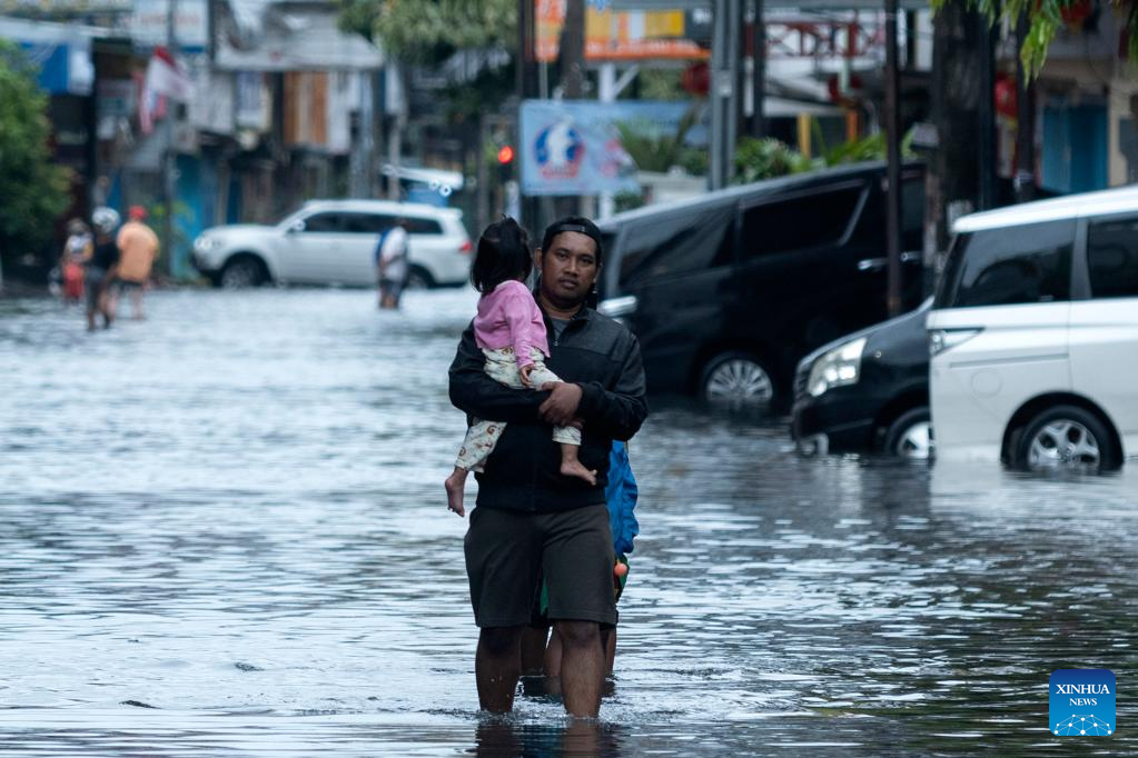 A man holding a little girl wades through a flooded area after heavy rain in Makassar, South Sulawesi, Indonesia, Feb. 13, 2023. (Photo by Niaz Sharief/Xinhua)