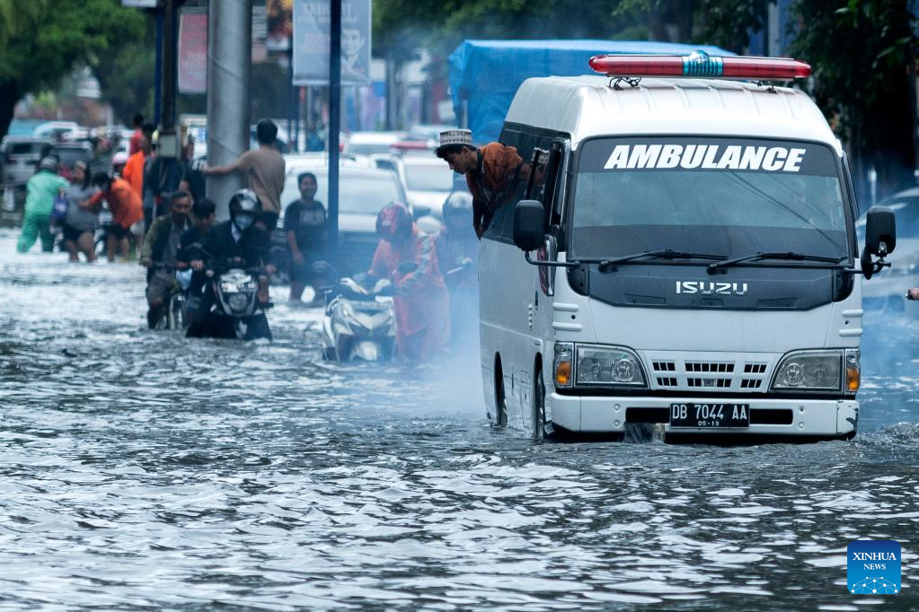 An ambulance runs on a flooded road after heavy rain in Makassar, South Sulawesi, Indonesia, Feb. 13, 2023. (Photo by Niaz Sharief/Xinhua)