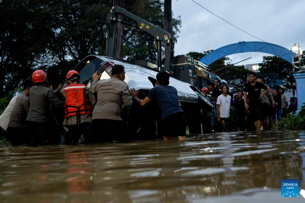 People try to evacuate a car submerged by floodwater after heavy rain in Makassar, South Sulawesi, Indonesia, Feb. 13, 2023. (Photo by Niaz Sharief/Xinhua)