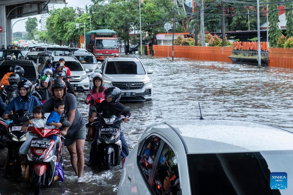 The traffic moves through a flooded area after heavy rain in Makassar, South Sulawesi, Indonesia, Feb. 13, 2023. (Photo by Niaz Sharief/Xinhua)