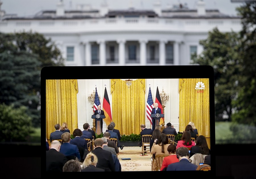 This photo taken in Arlington of Virginia, the United States, shows a screen displaying U.S. President Joe Biden (R) and German Chancellor Olaf Scholz attending a press conference at the White House in Washington, D.C. on Feb. 7, 2022. (Xinhua/Liu Jie)