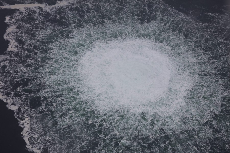This aerial photo released by the Danish Ministry of Defense on Sept. 27, 2022 shows the Nord Stream gas pipeline leak site. (Danish Defense Ministry/Handout via Xinhua)