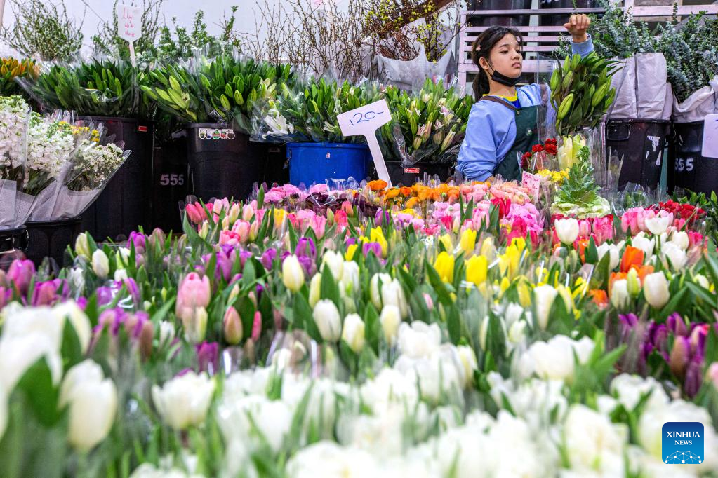 A vendor arranges flowers from southwest China's Yunnan province at the Pak Khlong Talat flower market in Bangkok, Thailand, Feb. 21, 2023.
