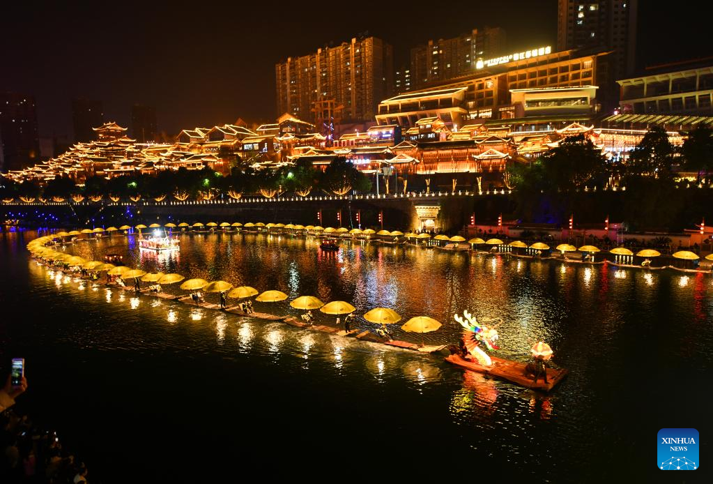 People take sightseeing boats at a scenic spot in Xuan'en County, central China's Hubei Province, Jan. 28, 2023. Xuan'en County has built footpaths, fountains and snack booths along the Gongshui River to boost nighttime economy. (Photo by Wang Jun/Xinhua)