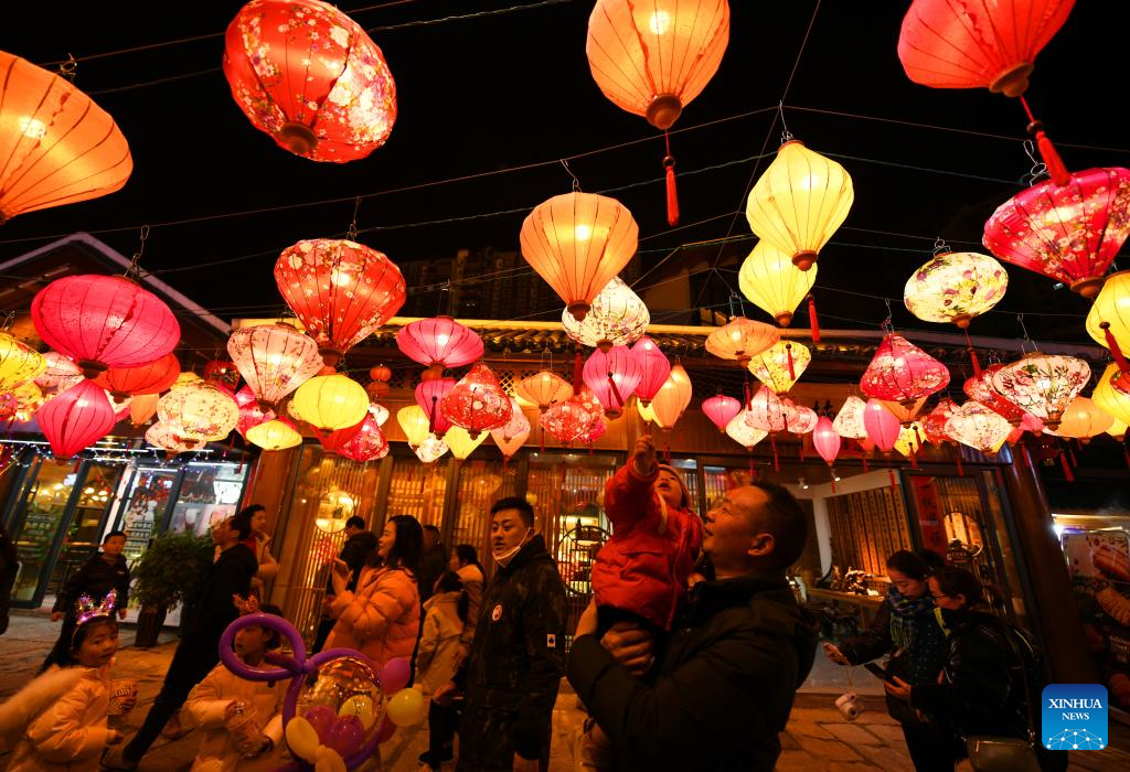 People enjoy lanterns at a scenic spot in Xuan'en County, central China's Hubei Province, Jan. 28, 2023. Xuan'en County has built footpaths, fountains and snack booths along the Gongshui River to boost nighttime economy. (Photo by Wang Jun/Xinhua)