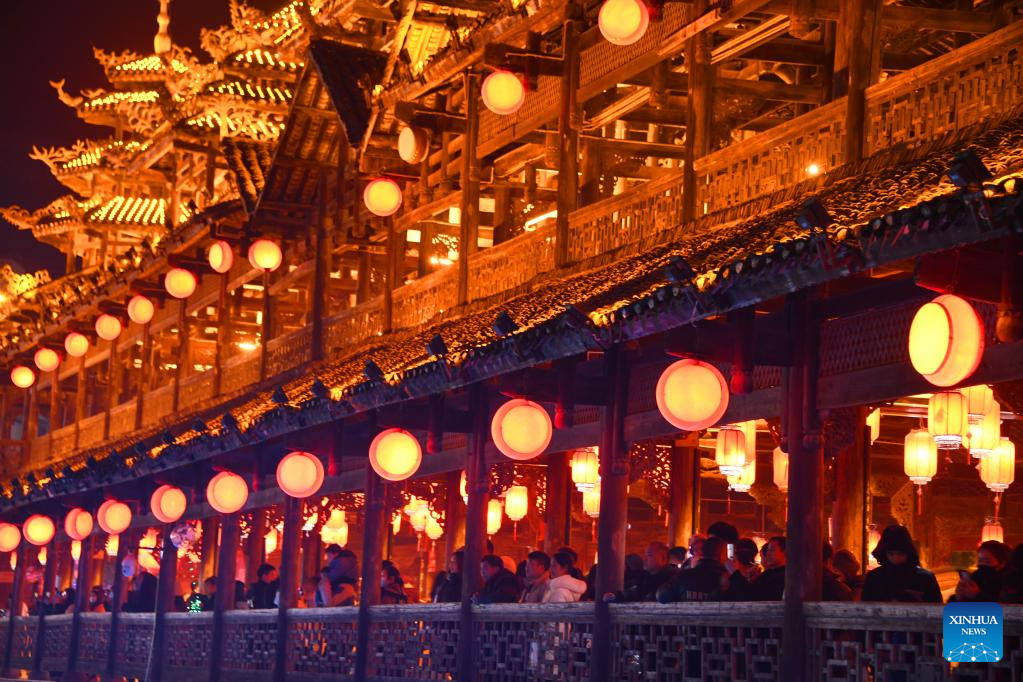 People visit the Fengyu bridge at a scenic spot in Xuan'en County, central China's Hubei Province, Jan. 28, 2023. Xuan'en County has built footpaths, fountains and snack booths along the Gongshui River to boost nighttime economy. (Photo by Wang Jun/Xinhua)