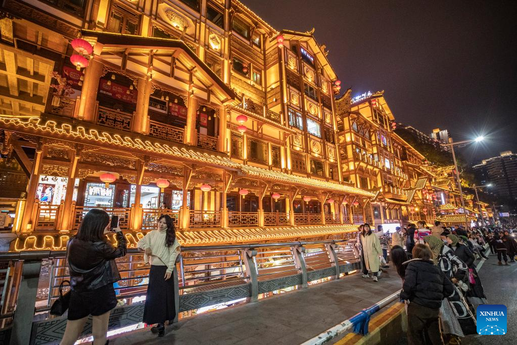 Tourists visit a traditional scenic area in Yuzhong District in southwest China's Chongqing Municipality, Feb. 10, 2023. Chongqing has launched a variety of activities at nighttime to boost night economy since the beginning of this year. (Xinhua/Huang Wei)