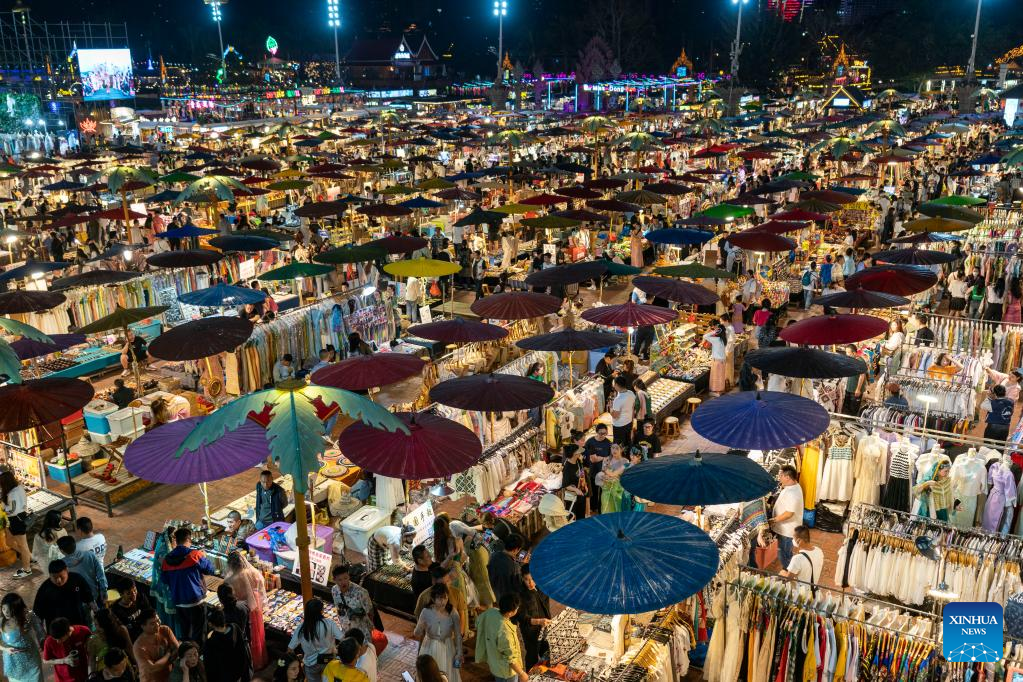 This photo taken on Feb. 12, 2023 shows a night fair in Jinghong City of Xishuangbanna Dai Autonomous Prefecture, southwest China's Yunnan Province.