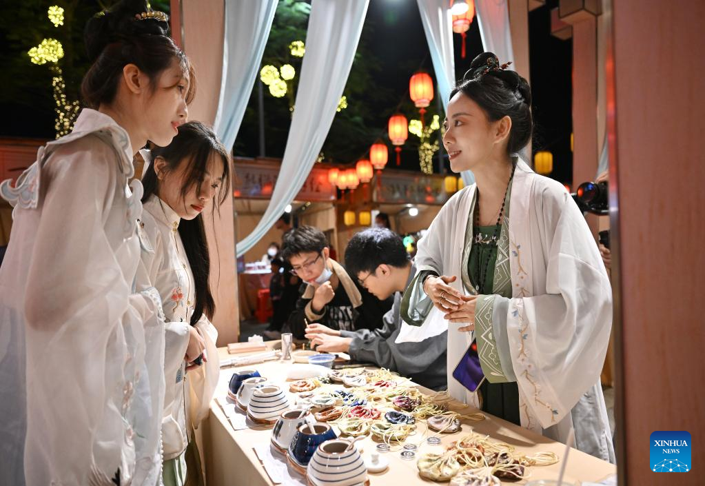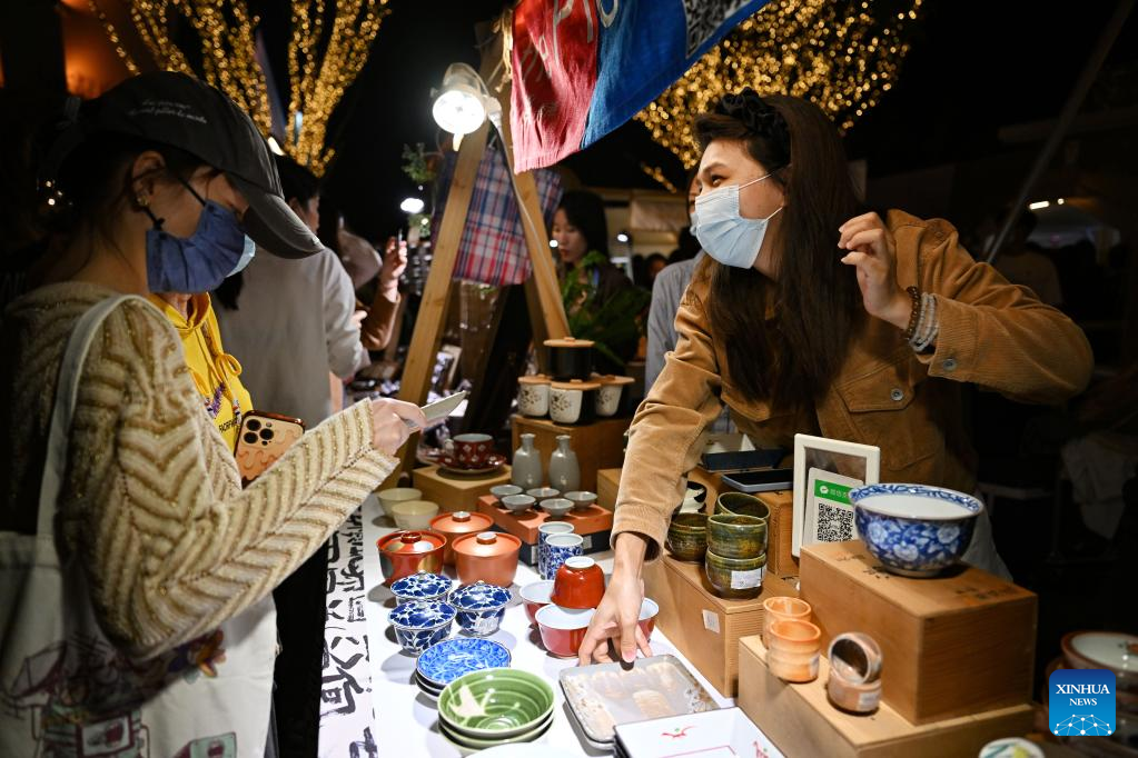 People select accessories at the night market of Laowaitan, a signature pedestrian street in Ningbo, east China's Zhejiang Province, Feb. 15, 2023. As the temperature gradually rises, a series of activities such as night market and "iron flowers", a performance of splashing molten iron to create fireworks, are held at Laowaitan to enrich the night life of citizens and tourists. (Xinhua/Jiang Han)