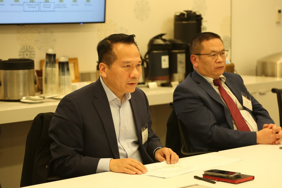 Bryan Lin (L), CEO of Huatai Securities (USA), Inc., makes a presentation during a panel discussion organized by the American Chinese Finance Association (ACFA) in New York, the United States, on Feb. 23, 2023. (Xinhua/Liu Yanan)