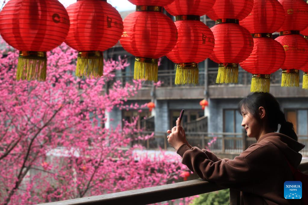 A visitor takes photos at Zhuoshui ancient town in Qianjiang District of southwest China's Chongqing, Feb. 25, 2023. (Photo by Yang Min/Xinhua)