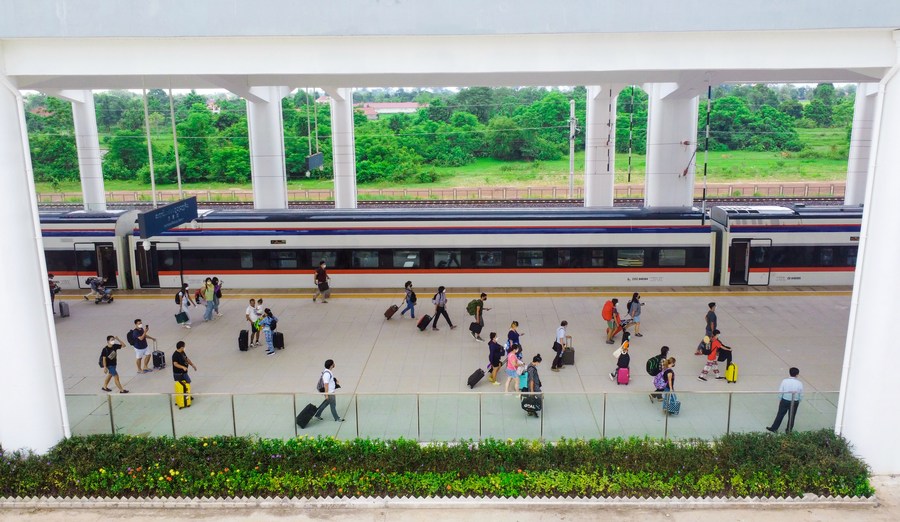 Passengers of the Lane Xang EMU train arrive at Vientiane, Laos, July 31, 2022. (Photo by Yang Yongquan/Xinhua)