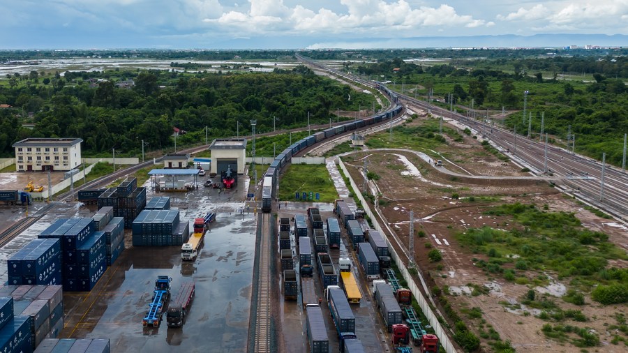 Aerial photo taken on Aug. 9, 2022 shows cross-border goods being transported at Vientiane South Station of China-Laos Railway in Laos.(Photo by Kaikeo Saiyasane/Xinhua)