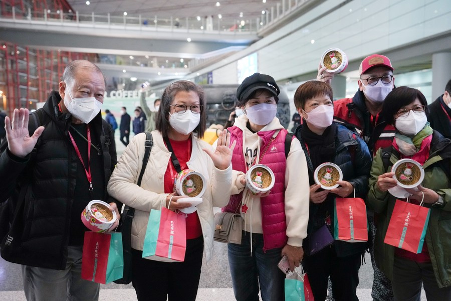 Tourists of the first tour group from Hong Kong pose for a group photo with souvenirs in their hands at Beijing Capital International Airport in Beijing, capital of China, Feb. 6, 2023.(Xinhua/Ju Huanzong)