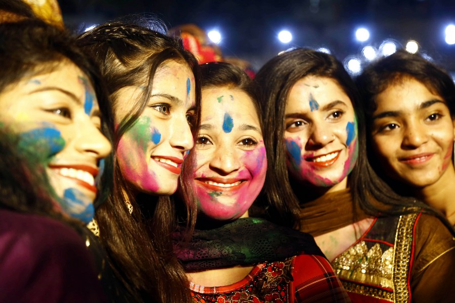 Pakistani women smeared with colored powder on their faces celebrate the Holi Festival in southern port city of Karachi on March 6, 2023. (Str/Xinhua)