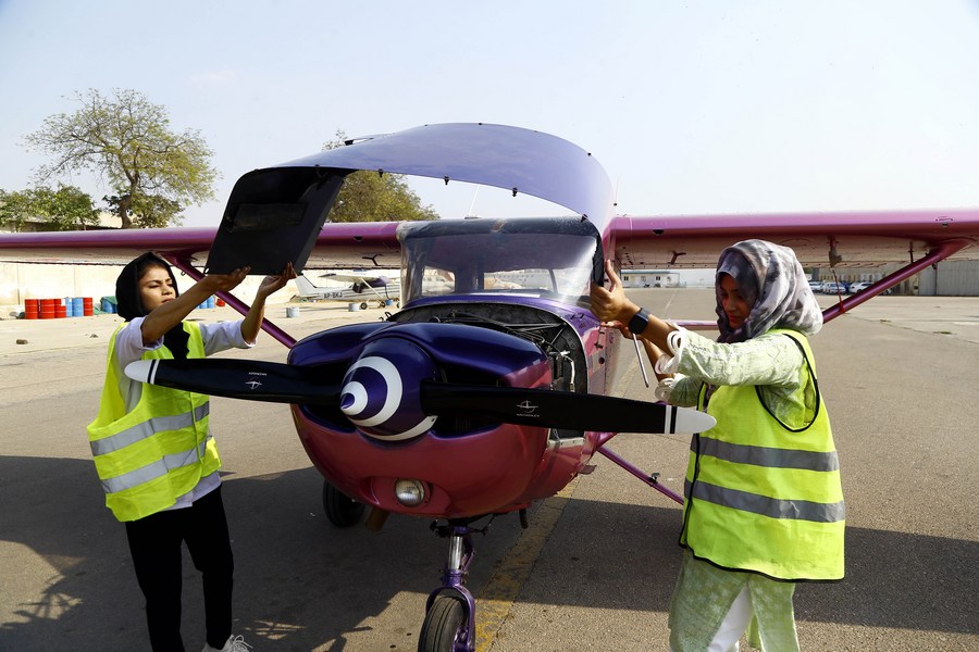 Women are working to maintain a trainer aircraft at a flying academy on International Women's Day in southern Pakistani port city of Karachi on March 8, 2023. (Str/Xinhua)