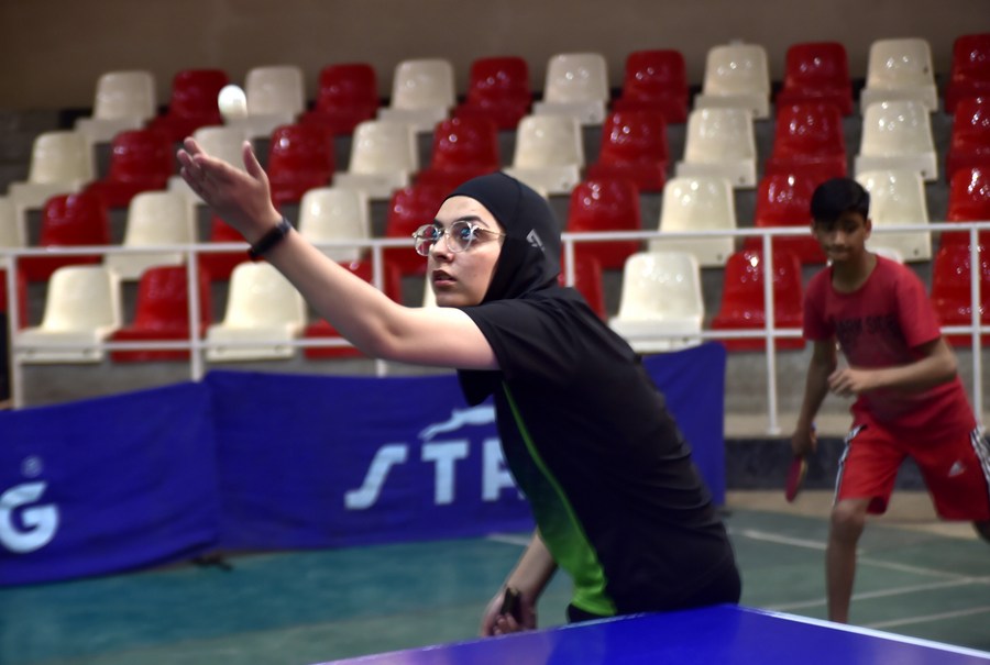 Iqra Rehman, a Pakistani table tennis player plays during a practice session in northwest Pakistan's Peshawar on March 8, 2023. (Photo by Saeed Ahmad/Xinhua)