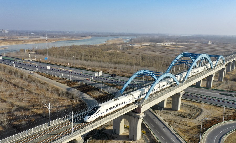 This aerial photo taken on Dec. 29, 2022 shows a train passing by the Yellow River in Zhongwei City, northwest China's Ningxia Hui Autonomous Region.(Xinhua/Feng Kaihua)