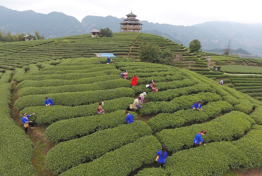 Aerial photo taken on Feb. 23, 2017 shows farmers picking tea leaves at Buyang Village of Bajiang Township in Sanjiang Dong Autonomous County, south China's Guangxi Zhuang Autonomous Region. (Xinhua/Lu Boan)