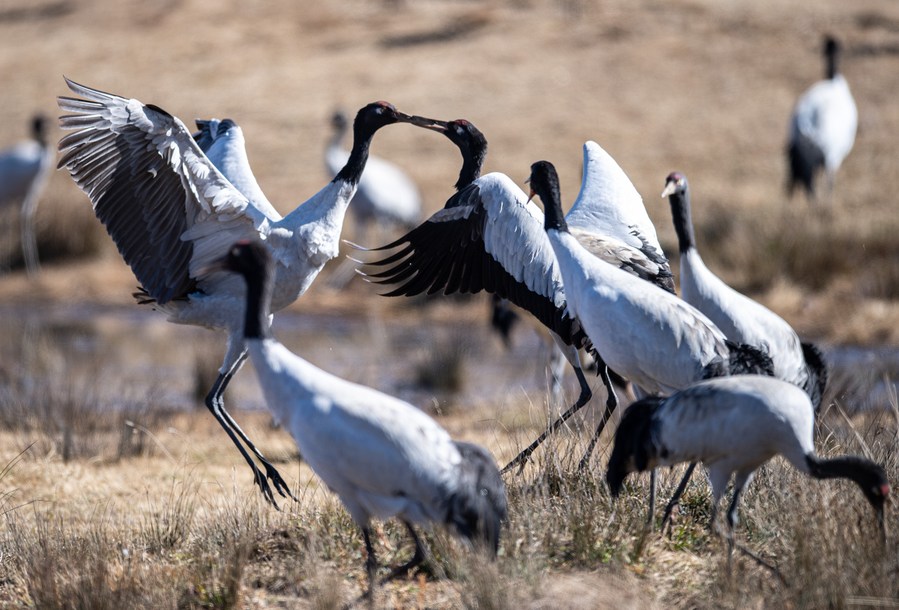 Black-necked cranes are pictured at Yunnan Dashanbao National Nature Reserve for Black-necked Cranes in Zhaotong, southwest China's Yunnan Province, Dec. 11, 2022. (Xinhua/Wang Guansen)