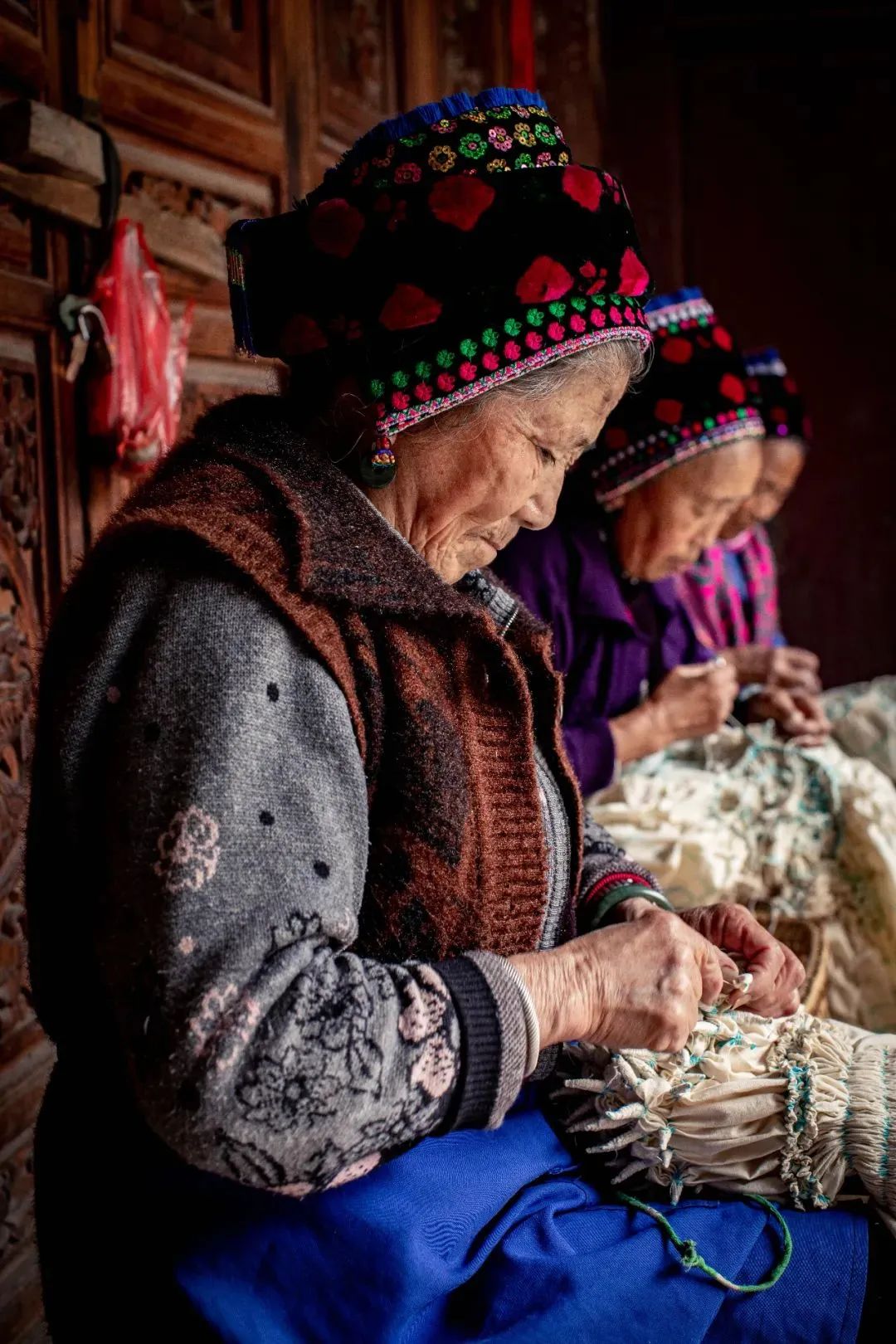 Several local elders of the Bai ethnic group are using needle and thread to make different folds in a cloth.
