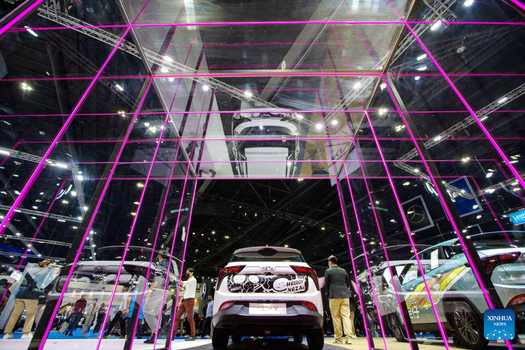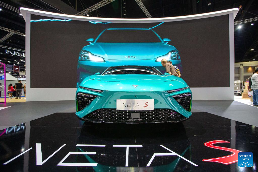 A visitor looks at a NETA S produced by Chinese electric carmaker Hozon Auto during the 44th Bangkok International Motor Show in Bangkok, Thailand, March 22, 2023. The 44th Bangkok International Motor Show kicked off here on Wednesday and will last until April 2. (Xinhua/Wang Teng)