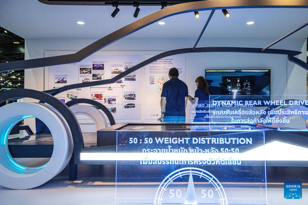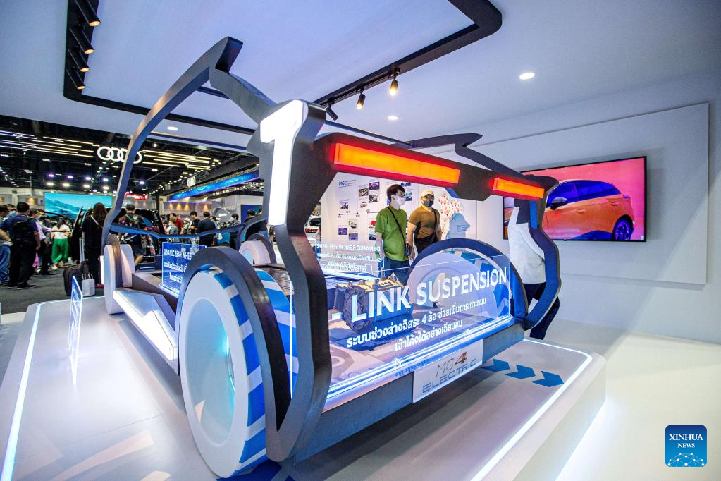 People visit the booth of MG Motor during the 44th Bangkok International Motor Show in Bangkok, Thailand, March 22, 2023. The 44th Bangkok International Motor Show kicked off here on Wednesday and will last until April 2. (Xinhua/Wang Teng)