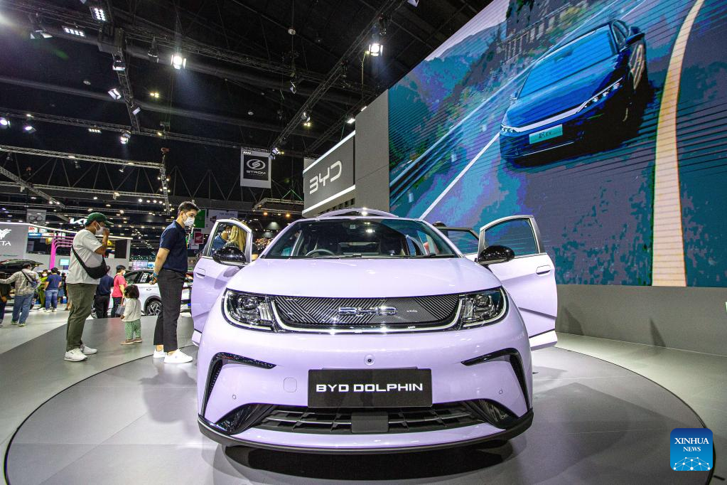 Visitors look at a BYD Dolphin during the 44th Bangkok International Motor Show in Bangkok, Thailand, March 22, 2023. The 44th Bangkok International Motor Show kicked off here on Wednesday and will last until April 2. (Xinhua/Wang Teng)