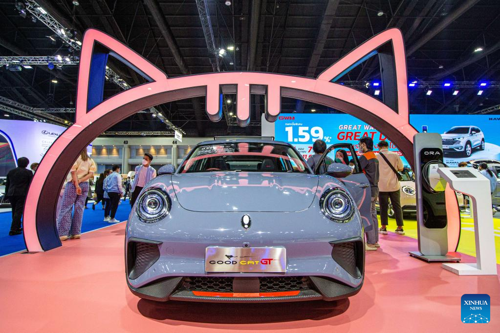 Visitors look at an ORA Good Cat GT during the 44th Bangkok International Motor Show in Bangkok, Thailand, March 22, 2023. The 44th Bangkok International Motor Show kicked off here on Wednesday and will last until April 2. (Xinhua/Wang Teng)