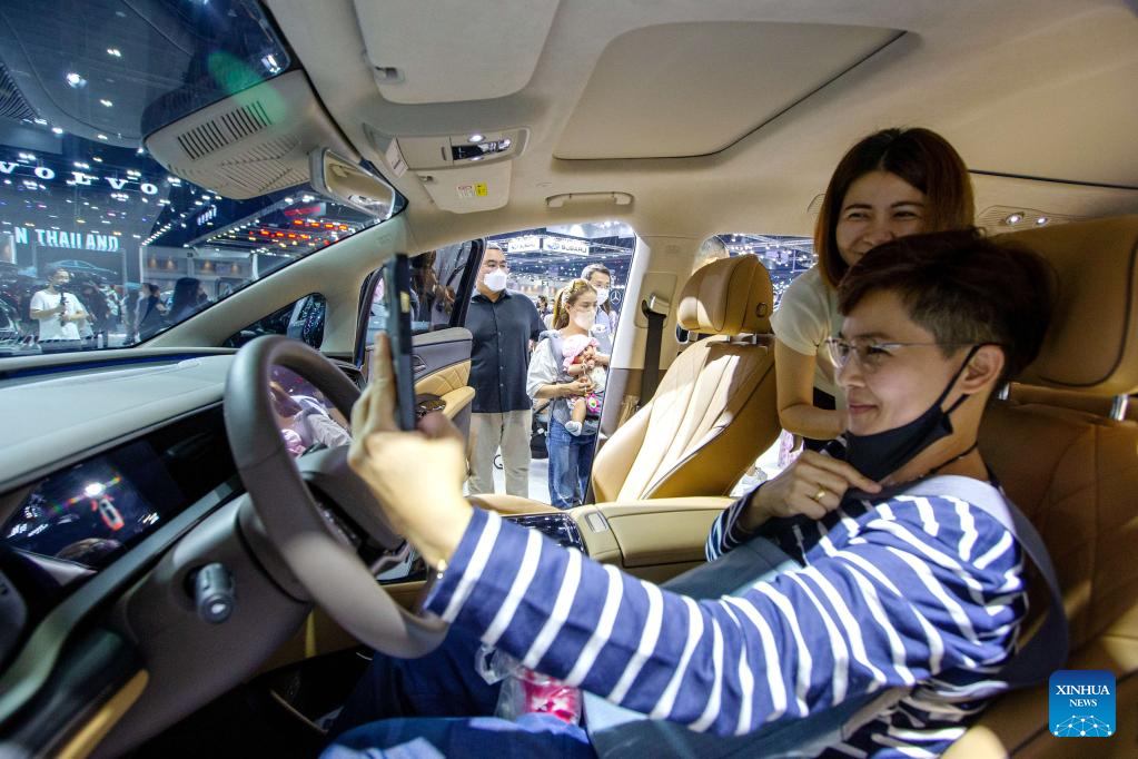 Visitors take selfies in a Denza D9 MPV during the 44th Bangkok International Motor Show in Bangkok, Thailand, March 22, 2023. The 44th Bangkok International Motor Show kicked off here on Wednesday and will last until April 2. (Xinhua/Wang Teng)