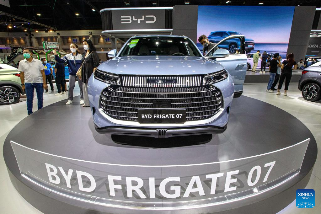 Visitors look at a BYD Frigate 07 SUV during the 44th Bangkok International Motor Show in Bangkok, Thailand, March 22, 2023. The 44th Bangkok International Motor Show kicked off here on Wednesday and will last until April 2. (Xinhua/Wang Teng)