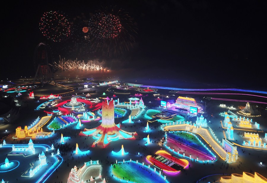 This aerial photo taken on Jan. 5, 2023 shows a fireworks show at the Harbin Ice-Snow World theme park in Harbin, northeast China's Heilongjiang Province. (Xinhua/Wang Jianwei)