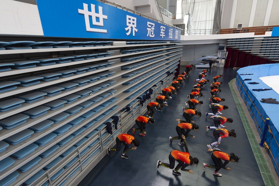 This photo taken on Feb. 24, 2022 shows students of a vocational college warming up ahead of a short track speed skating training session at Qitaihe Sports Center in Qitaihe, northeast China's Heilongjiang Province. (Xinhua/Xie Jianfei)