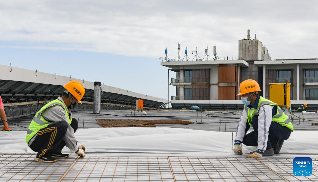 Workers perform tasks at a building renovation project in the zero-carbon demonstration zone in Boao, south China's Hainan Province, Jan. 12, 2023.