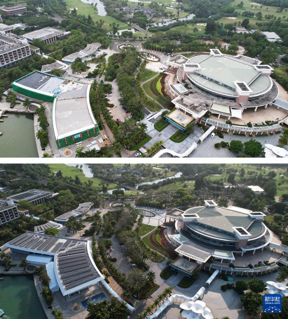 This combo aerial photo shows the Boao Forum for Asia (BFA) International Conference Center (R) and the press center of the BFA under renovation on Jan. 12, 2023 (above) and after the renovation on March 14, 2023 (below), in Boao, south China's Hainan Province.