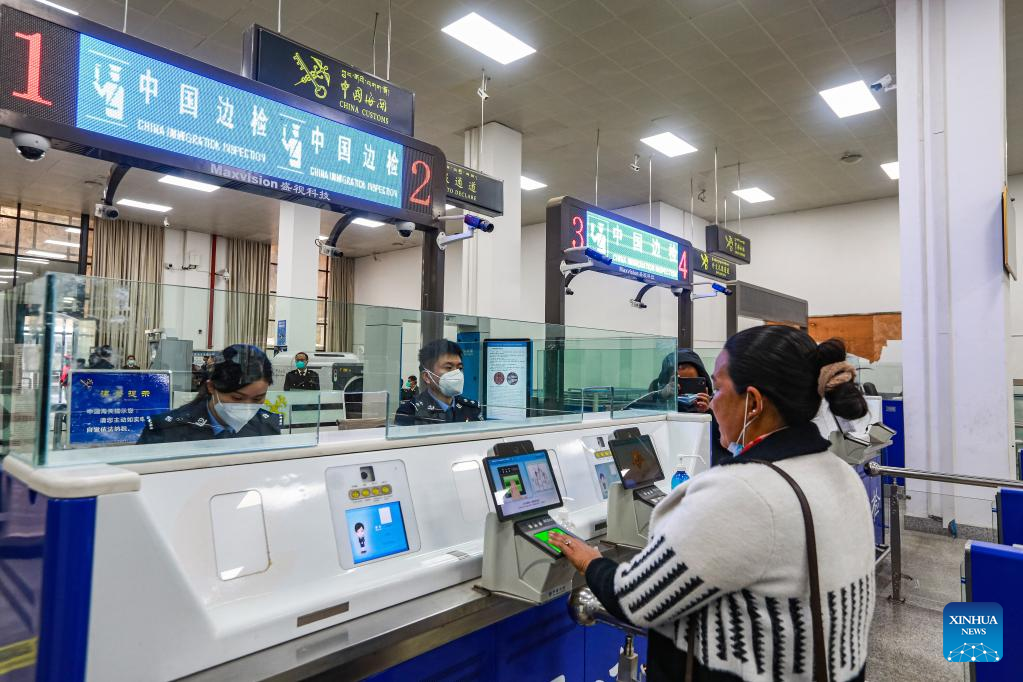 A passenger has passenger clearance processed at the Gyirong port in southwest China's Tibet Autonomous Region, April 1, 2023. (Photo by Xiao Fugui/Xinhua)