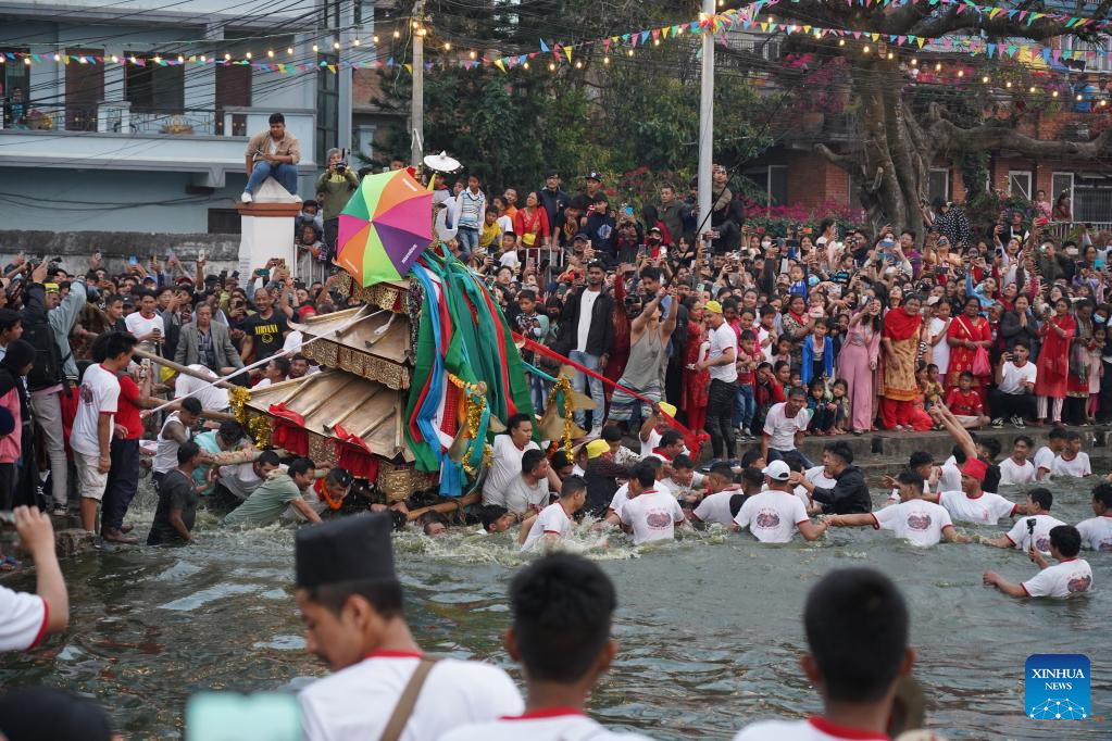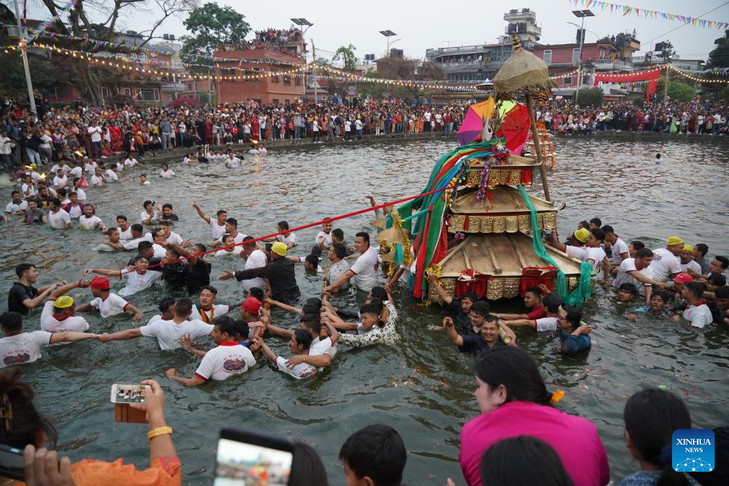 Local people carry on their shoulders a chariot of Goddess Tundaldevi in search for her lost jewellery in a "jewel pond" known as Gahana Pokhari during the traditional Gahana Khojne Jatra festival in Kathmandu, Nepal, April 7, 2023. (Photo by Hari Maharjan/Xinhua)