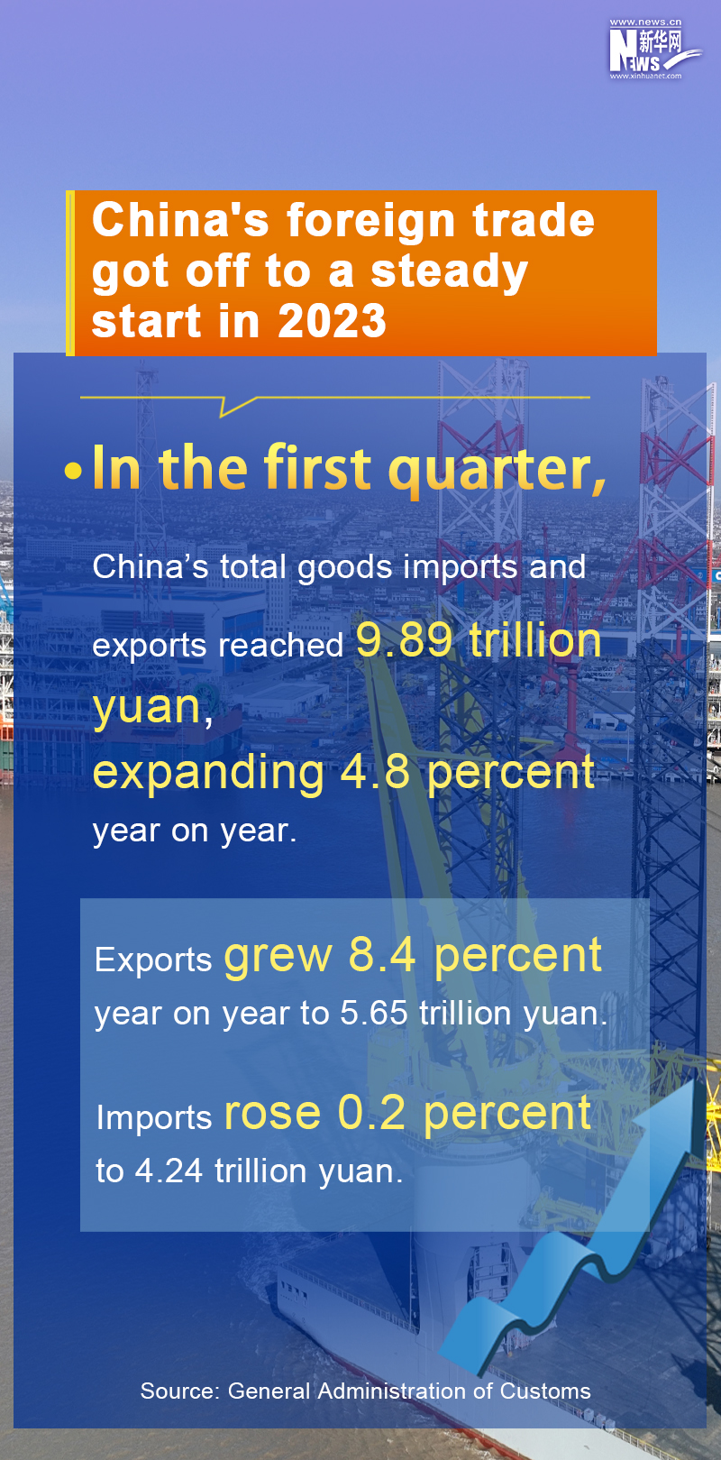 In the first three months, exports grew 8.4 percent year on year to 5.65 trillion yuan (about 823 billion U.S. dollars) while imports rose 0.2 percent to 4.24 trillion yuan, bringing the total trade to 9.89 trillion yuan.