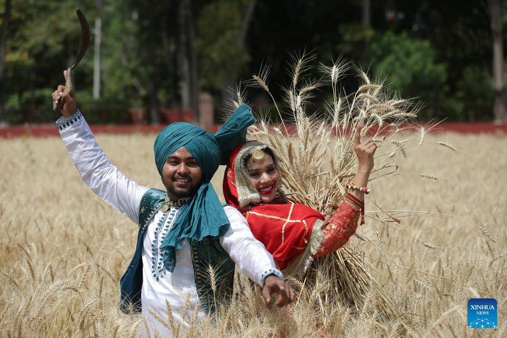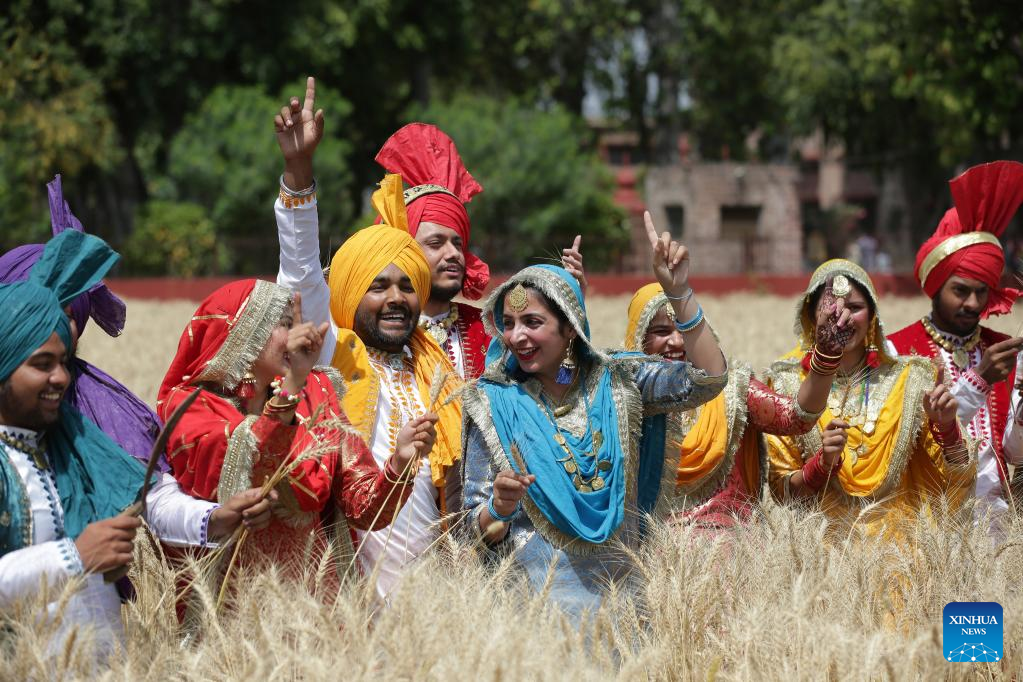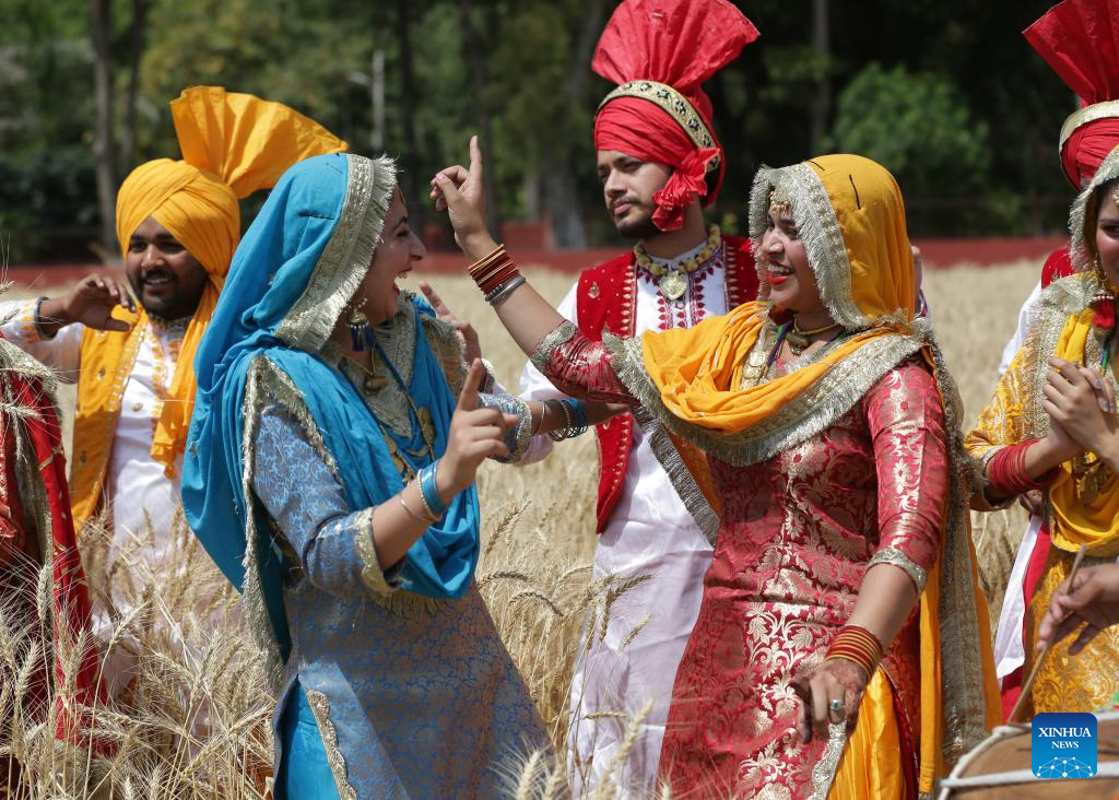People wearing traditional Punjabi attire sing folk songs and perform folk dances during festival Baisakhi in a wheat farm in Amritsar district of India's northern Punjab state, April 13, 2023. Baisakhi is one of the most popular festivals celebrated in the Indian state of Punjab to mark the harvest. (Str/Xinhua)